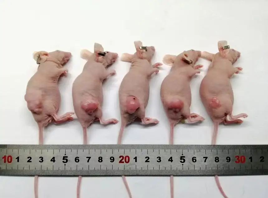 选择没有胸腺等免疫器官的裸鼠、NOD-Scid和NCG等,鼠龄为4-6周、体重16-18g,肿瘤细胞系种植部位选择血供丰富区域,如腋窝中后部等。